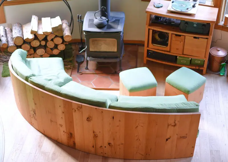 I designed this one for a Mandala Home and the sofa had to wrap around the wood stove while allowing good foot traffic to the other spaces of this open-concept room. It is made out of reclaimed Douglas fir with a rough-sawn texture contrasting with the smooth back. It is made out of several sections that connect on-site. The upholstery is custom-made to fit your space’s design.